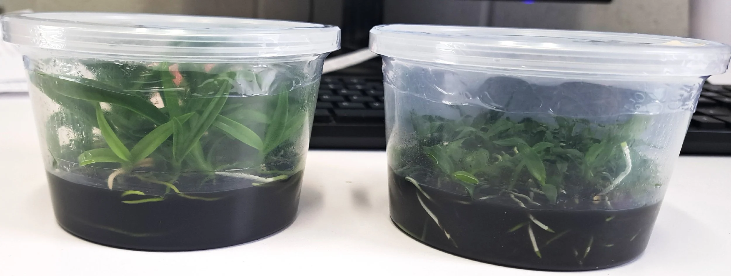 A comparison of two flasks from two different dendrobium grexes both plated around the same time. Sometimes all we know is they are “Dendrobium”, we do not know the expected size of either plant.